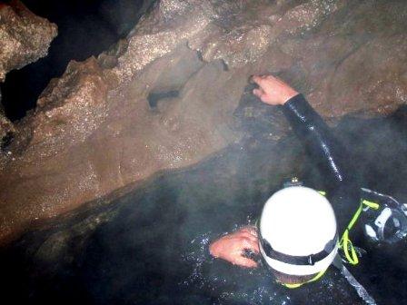 Ovde je kraj pećine. Postoji nekoliko potencijalnih kanala kroz koje mislimo da se može proći. Uroš, kao najiskusniji među nama, zaranja prvi. Pop i ja ga čekamo.